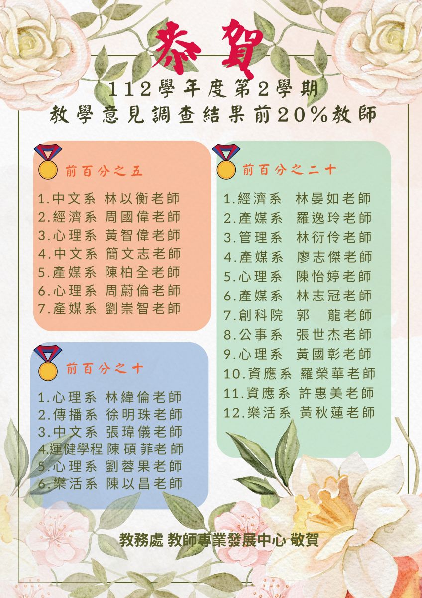 佛光大學作為教學型大學,致力於傳統書院精神的現代實踐,感謝每位教師對教學之投入與付出,為國家社會培育人才。教學意見調查之總分算法為30%教學滿意度及70%學生學習成效,採計「單一教師授課」且「填答人數10人以上」之課程分數平均。112學年度第2學期教學意見調查結果位居全校前20%之教師名單如下表,感謝老師們為教學投注心力。